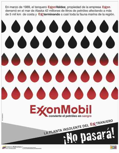 Ejemplo de ello es la imagen que acompaña este post, que si no llega a leerse por el tamaño, vale mencionar lo que dice: "En marzo de 1989, el tanquero Exxon Valdez, propiedad de la empresa Exxon, derramó en el mar de Alaska 42 millones de litros de petróleo afectando a más de 5 mil Km. de costa y Exxterminando a casi toda la fauna de la región (...) ExxonMobil convierte el petróleo en sangre" dice el panfleto, y finaliza con la oración "No pasará" en clara alusión al discurso de varios oficialistas donde aseguran que la petrolera arremete moralmente contra Venezuela por la congelación de bienes en el extranjero.