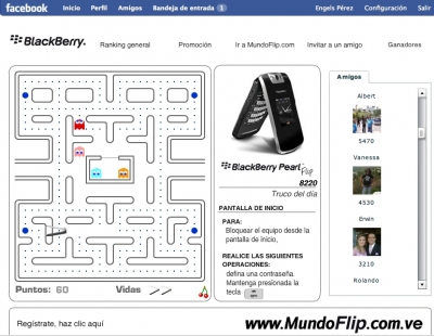 NOTA: Se trata de un aplicación en Facebook al estilo de Pacman, patrocinada porMovistar que requiere registro en un sitio web externo. En efecto sortean Blackberrys Pearl.