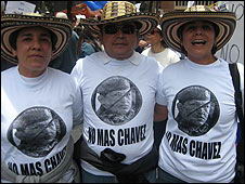 Grupos antichavistas se congregaron en las principales vías deciudades como Bogotá, Medellín, Cali, Barranquilla y Cúcuta. BBC. Partedel origen de la movilización tuvo que ver con las declaracionesofrecidas por el presidente Chávez en su programa dominical en el queacusó a los colombianos de ser "traidores" y los invitaba a sumarse asu "doctrina bolivariana".Loscolombianos han tenido más de un motivo para unirse a la marcha,especialmente después que el presidente Chávez congeló las relacionesbilaterales. Su decisión ha impactado negativamente en el intercambiocomercial que el año pasado pasó de 7.000 millones de dólares. Lasimportaciones y exportaciones han caído, arruinando a los trabajadores.