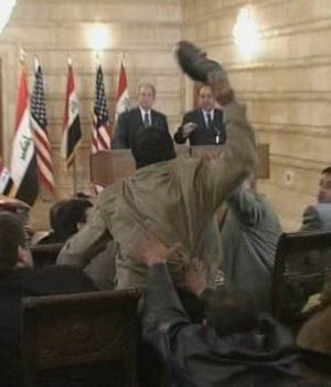 Según la BBC, en esa oportunidad también gritó que Bush era "un perro" y que los zapatos eran "un beso de despedida" de aquellos que habían muerto, quedado huérfanos o enviudado en Irak. Bush pudo esquivar los zapatos y no pareció molesto por el incidente, haciendo incluso bromas tras enterarse de que eran talla 10.
