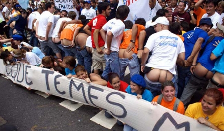 Estudiantes venezolanos (representando a las universidades nacionales) marcharon hasta la Cancillería donde consignaron un documento exigiendo la entrada de la CIDH y luego se bajaron los pantalones.