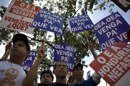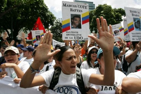 Con la consigna "Marcha estudiantil desarmada por los derechos humanos", los estudiantes liderados por Rebeca Rojas de la UDO, Roberto Patiño de la USB entregaron al director del despacho de la Cancillería, Ramón Goldin, el documento que exige al gobierno que permita la entrada de la Comisión Interamericana de Derechos Humanos al país.