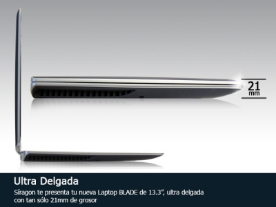 La Blade posee un grosor de tan sólo 21mm la cual la hace una laptop ultra delgada. Su innovador diseño con cuerpo de magnesio para mayor durabilidad y un grosor de tan sólo 21mm, está hecha pensando en una tendencia vanguardista para ofrecer un producto de primera categoría para aquellos que desean una laptop única en su estilo. Soporta conexión a Internet Móvil 3G, además del estándar de conexión inalámbrica Wi-Fi y LAN a través de cable. La antena 3G es integrada, por lo que solo necesita encender la laptop y empezar a disfrutar de la alta velocidad de navegación.