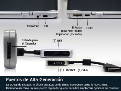 - Incluye mini puerto replicador: 2 puertos USB v2.0, 1 puerto VGA, 1 puerto Ethernet RJ45 y puerto para adaptador de corriente