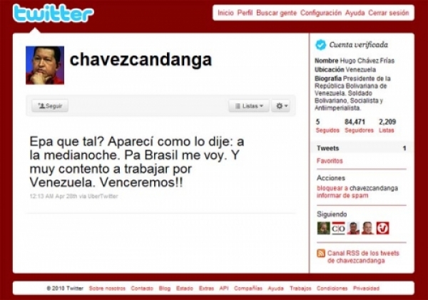 @chavezcandanga ya tiene 84.471 seguidores en Twitter. La cuenta del presidente Hugo Chávez, recién inaugurada está en 2.209 listas y va en aumento.