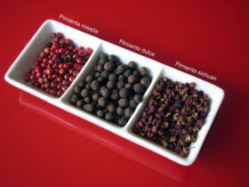 Pimienta de Jamaica: Con notas a clavo de olor, canela y nuez moscada se la conoce en inglés como allspice (todas las especias). Muy utilizada en la cocina de Medio Oriente es también un ingrediente fundamental de la salsa barbacoa y del queso Moutier, una variante del Camembert. Como los granos son más grandes que el resto de las pimientas es mejor molerla por separado si se va a utilizar mezclada.